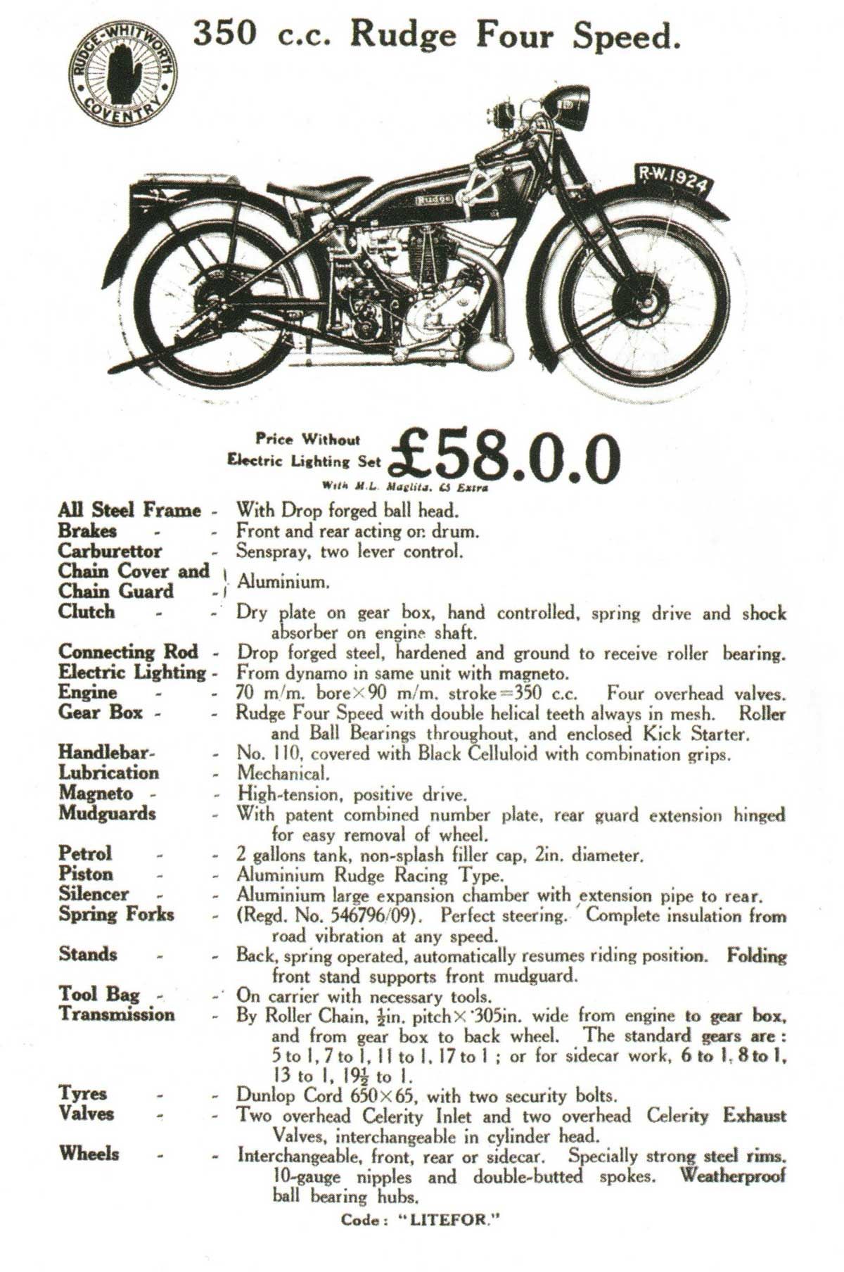 Four valve 346cc with cast iron open valve cylinder head, parallel inlet valves and parallel exhaust. Forward facing parallel exhaust ports with flange fitting to exhausts.18mm side plug. Rockers supported on cast support with clamps to rocker spindles. Sloping pushrods. Square scalloped based cylinder barrel and plain drive side crankcase. Total loss oiling with Best & Lloyd pump mounted on timing cover.