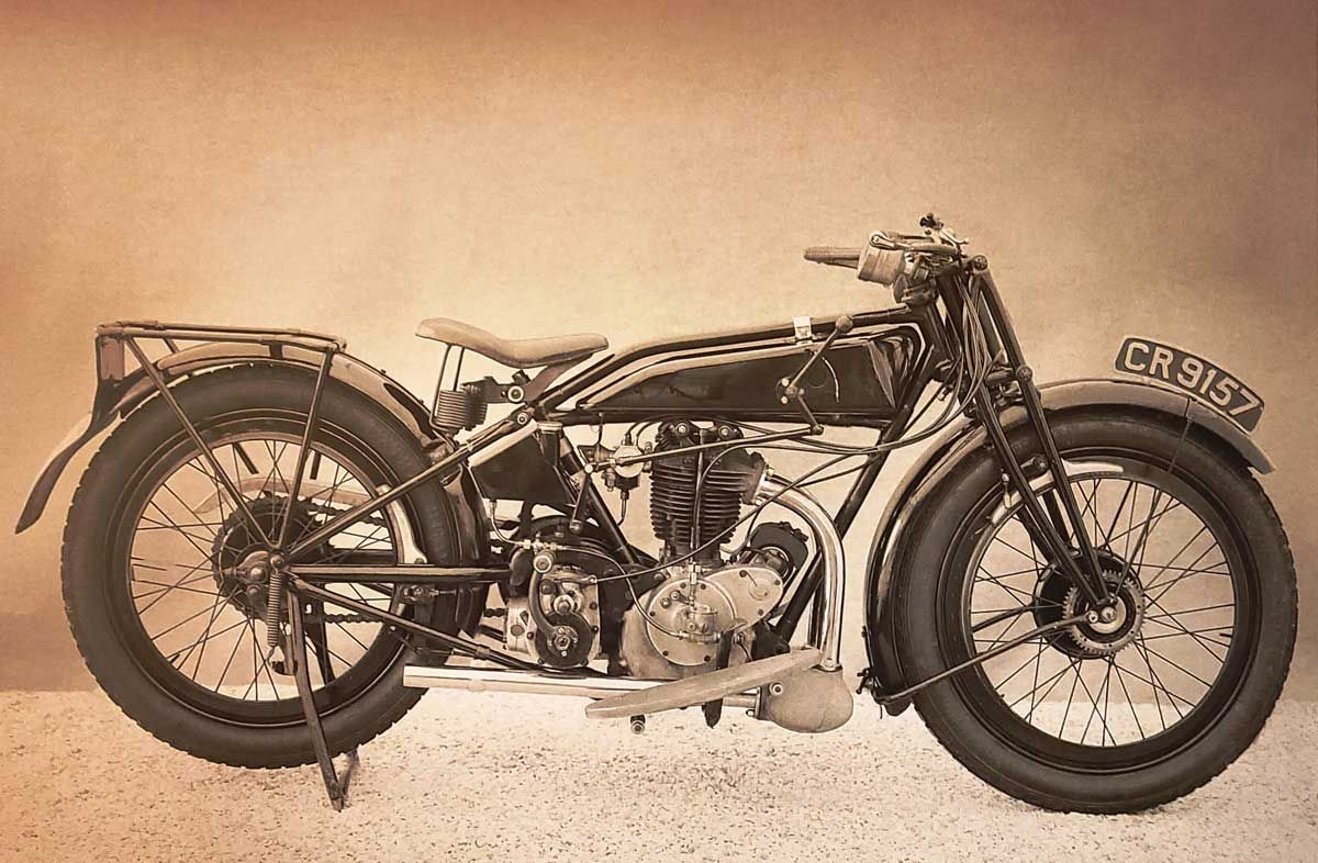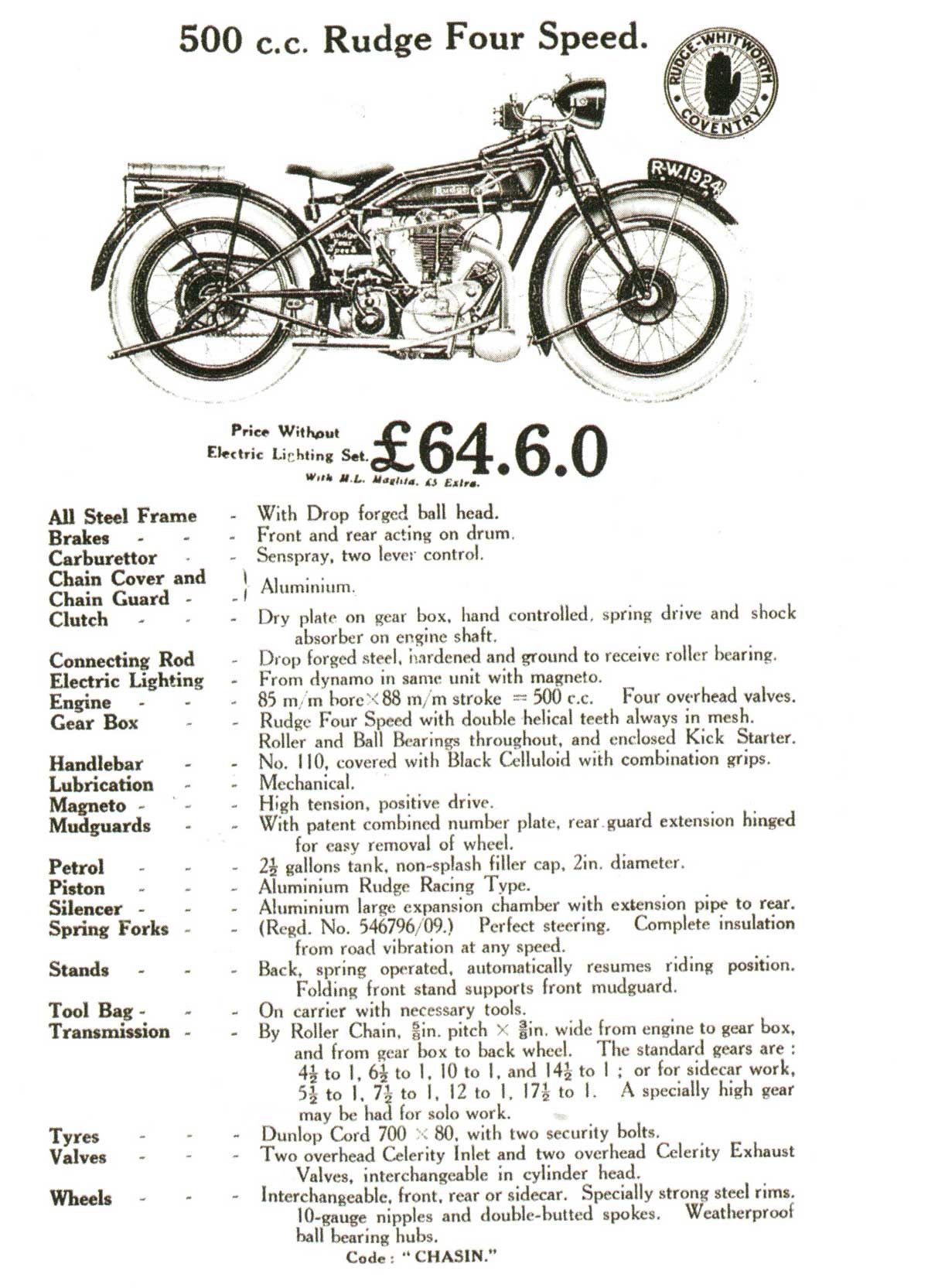 4 valve 499cc with cast iron open valve cylinder head, parallel inlet valves and parallel exhaust. Rebound spring between rockers. Forward facing parallel exhaust ports with flange fitting to exhausts.18mm side plug. Rockers supported on cast support with clamps to rocker spindles. Square scalloped based cylinder barrel and plain drive side crankcase. Total loss oiling with Best & Lloyd pump mounted on timing cover.
