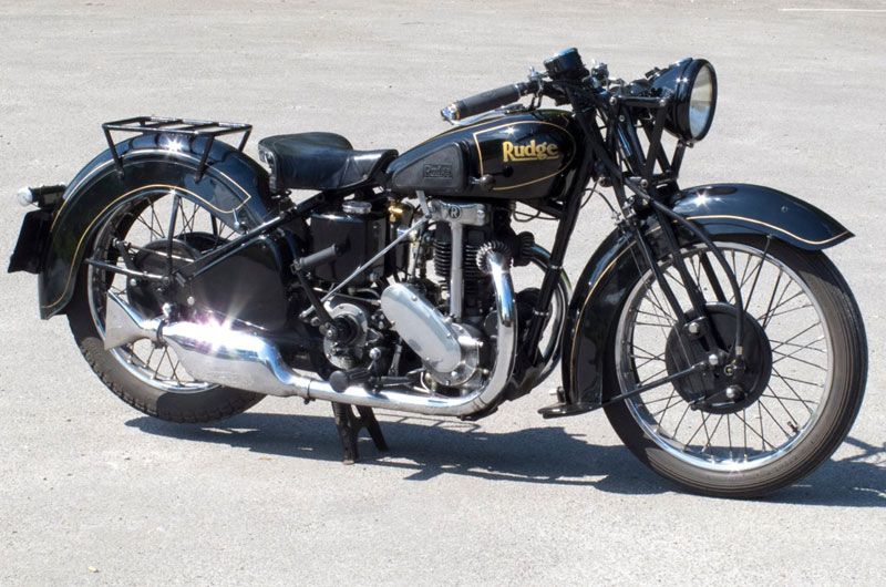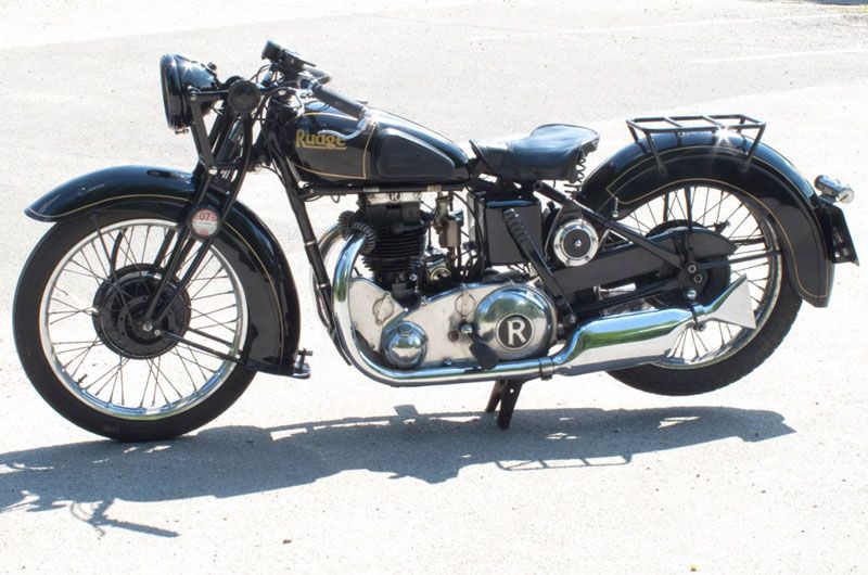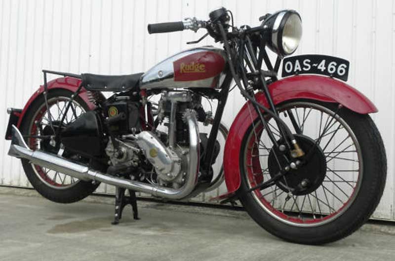 Pillion footrests, Rudge quickly detachable and interchangeable wheel on Watsonian or Swallow sidecar, Leg shields and footchange. All black petrol tank finish. Export model sump bash pad.