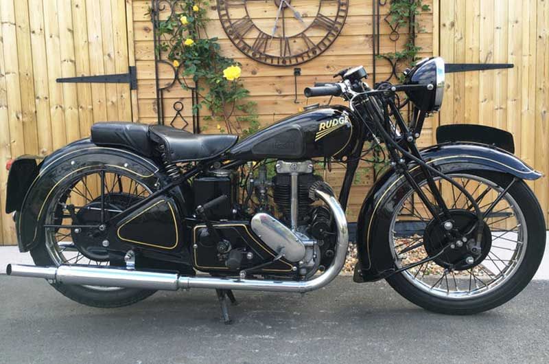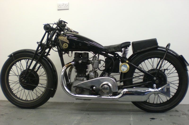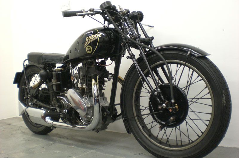 Upswept exhaust pipes, pillion footrests, Rudge quickly detachable and interchangeable wheel on Watsonian or Swallow sidecar. Leg shields. Export model sump bash pad.